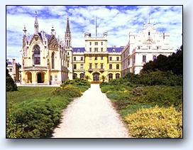 Dnešní podoba zámku Lednice je výsledkem přestavby z let 1846-1858 v duchu anglické novogotiky. Autorem přestavby byl Jiří Wingelmüller. Z barokního období stavebních dějin zámku se dochovala budova jízdárny z konce 17. století od architekta J.B. Fischera z Erlachu. Veřejnosti přístupné místnosti v přízemí zámku vynikají zejména bohatostí řezbářské výzdoby. V roce 1995 byla prohlídková trasa rozšířena o novou část. Jde o soukromé apartmá, které až do své smrti v roce 1881 užívala kněžna Františka z Lichtenštejna, vdova po Aloisovi II., knížeti z Lichtenštejna, stavebníkovi poslední, romantické novogotické přestavby zámku. K zámku přiléhá na východní straně skleník, postavený v letech 1843 - 1845 podle projektu P.H. Desvignese. Dokonalým rámcem zámku se skleníkem je francouzská zahrada a rozsáhlý krajinářský park s četnými romantickými stavbami. Z nich nejvíce vyniká minaret, ojedinělá architektonická památka vystavěná podle projektu Josefa Hardmutha v letech 1797-1804. Lednický zámek se zahradou a parkem je součástí krajinného celku Lednicko-valtického areálu, prohlášeného v roce 1996 za památku UNESCO. |